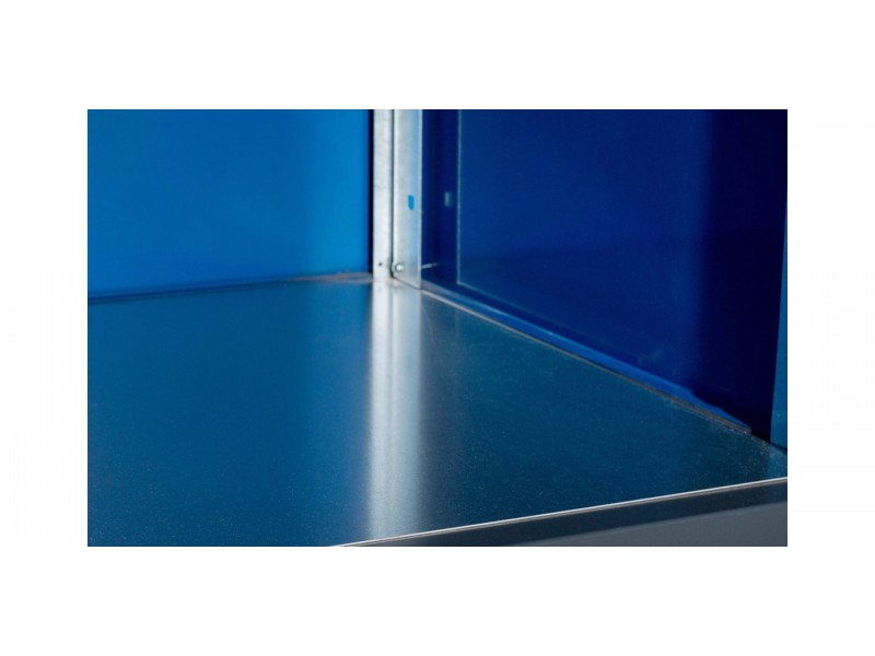 Systemgestell aus stabiler Schweißkonstruktion Profilrohr 40 mm x 40 mm x 1,5 mm Oben und unten einmontierte Tiefenverstrebungen Kunststoff-Höhenausgleicher bis max. 20 mm Buche-Multiplex-Arbeitsplatte mit bearbeiteten Kanten Schubladenwannen, Zwischenboden und Ablage aus verzinktem Stahlblech Schubladen-Rollenführungen kugelgelagert mit Auszugstopp Schubladen mit Einzelschließung Türen aus Qualitätsblech, selbstzuziehend Das Systemgestell und die nicht verzinkten Blechteile sind eisenphosphatiert und pulverbeschichtet