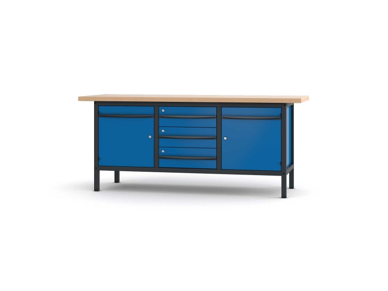Technische Daten: Systemgestell L 1735 x T 605 x H 815 mm Arbeitsplatte L 2000 x T 700 mm, 40 mm stark Schublade Innenmaß B 490 x T 460 mm Schubladenauszug 98% Schubladentragkraft 70,0 kg Türen 180° Öffnungswinkel Arbeitshöhe 855 mm Farbe: RAL 7016 anthrazitgrau / RAL 5010 enzianblau Flächenlast max. 1000 Kg