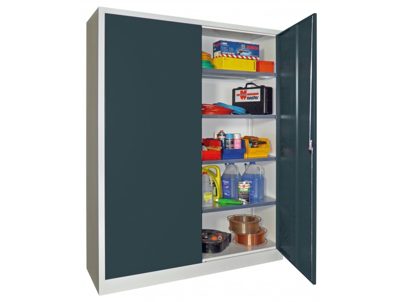 Fest verschweißte Stahlblechkonstruktion Pulverbeschichtetes Stahlblech, schlag- und kratzfest Verzinkte Fachböden mit V-Tasche, im Raster von 17 mm höhenverstellbar Türen mit Verstärkungstaschen, Drehgriff 3-riegelig, integriertes Zylinderschloss Schrankhöhe 1950 mm passend für 5 Ordnerhöhen DIN A4