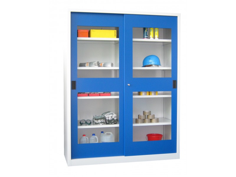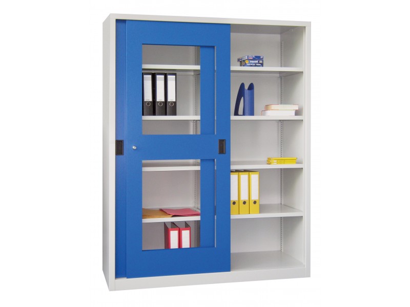 Fest verschweißte Stahlblechkonstruktion, extrem verwindungssteif durch Eckverschweißung Pulverbeschichtetes Stahlblech, schlag- und kratzfest Verzinkte Fachböden, im Raster von 17 mm höhenverstellbar Türen mit Verstärkungstaschen, auf kugelgelagerten Spezialrollen im oberen Führungsprofil, sichere Führung, mit Quetschschutz, auf Puffer aufschlagend Beide Türen zusammen durch ein Drehdruckzylinderschloß verschließbar Acrylglas-Sichtfenster, bruchsicher (die Schlagzähigkeit der Scheibe von 15 kJ/qm entspricht der Energie von ca. 1500 kg/qm bei einer Fallhöhe von 1m) Schrankhöhe 1950 mm passend für 5 Ordnerhöhen DIN A4