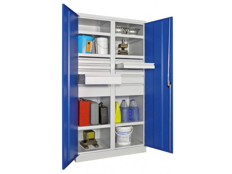 Technische Daten: Maße: 1950 x 1040 x 630 mm Belastbarkeit der Fachböden: Jeweils 120 kg bei gleichmäßig verteilter Last Belastbarkeit der Schubladen: Jeweils 60 kg bei gleichmäßig verteilter Last Gesamtbelastbarkeit je Schrank: 1300 kg bei gleichmäßig verteilter Last Farbe: z.B. RAL 7035 lichtgrau/RAL 5010 enzianblau