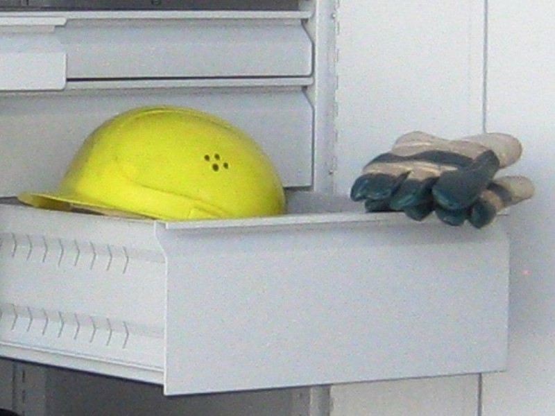 Fest verschweißte Stahlblechkonstruktion Sehr robust und verwindungssteif durch extra starkes Stahlblech Spezielle Konstruktion der Abkantungen Pulverbeschichtetes Stahlblech, schlag- und kratzfest Pulverbeschichtete Fachböden, im Raster von 25 mm höhenverstellbar Türen mit Verstärkungstaschen, Drehgriff 3-riegelig, integriertes Zylinderschloss Kugelgelagerte Schubladen mit integrierter Griffleiste Material zur Wandbefestigung (Verhinderung des Kippens bei ausgezogenen Schubladen durch bauseitige erforderliche Sicherung) Schrankhöhe 1950 mm
